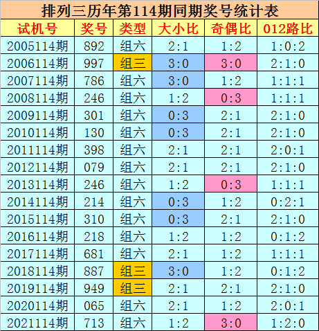 上期回顾:体彩排列三第2022114期奖号:997。,奇偶比3:0,大小比3:0,012比2:1:0。