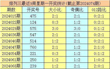 三、体彩排列三前9周星期一奖号分别开出:475-124-575-547-514-760-221-250-239,其中号码012路比为5:11:11,奇偶比为15:12,大小比为12:15;