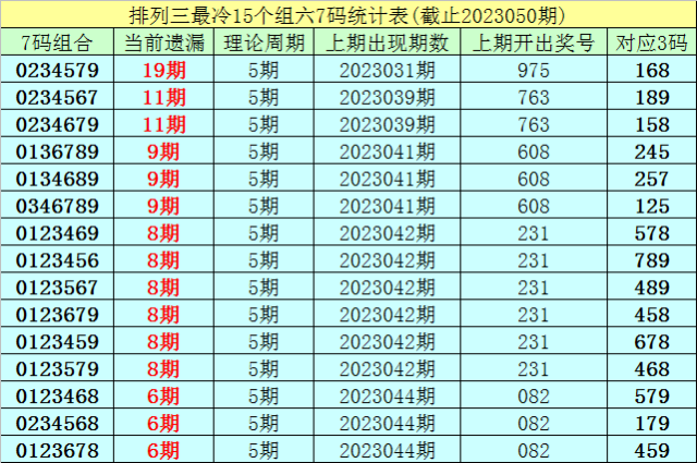 (1)在排列三已开出的6471期奖号中(统计截止第2023050期),目前7码组六遗漏值最大的组合为:0234579,本期遗漏19期;