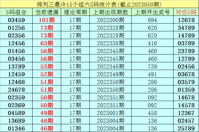 (4)排列三第2023050期遗漏值最大的十个5码组六组合解冻了0个;