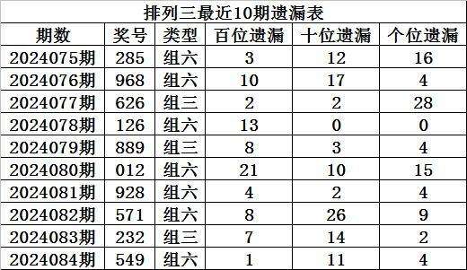 上期回顾:排列三第2024084期奖号:549,组六,直选遗漏总值为16期。