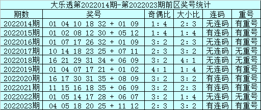 上期回顾:体彩大乐透第22023期奖号开出:04 05 18 20 25+11 12,前区奖号奇偶比为2:3,012路比为1:2:2,大小比为3:2,包含连码:04 05,包含1个重号:05。
