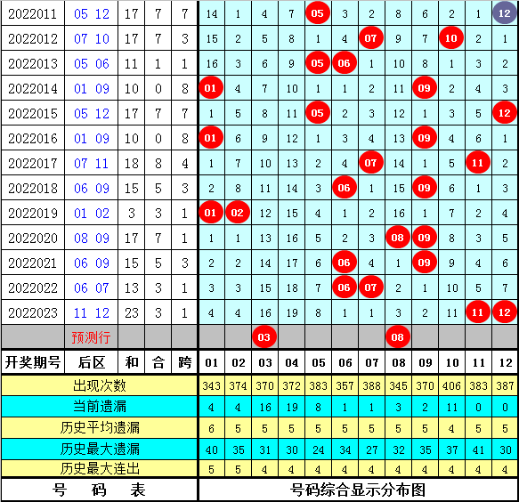 后区分析:上期后区奖号为11和12,最近10期后区各号码频次为:号码09出现5次,01、06出现3次,07、11、12出现2次,02、05、08出现1次,其中号码03、04、10没有出现,本期后区参考号码02、03、04、07、08、11,单注参考03+08。