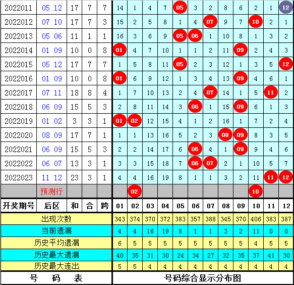 上期后区开出号码:11+12,一奇一偶组合、1路号断档、全大组合。本期后区看好全偶组合,关注两码02、10。