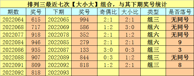 开奖回顾:排列三第2022092期开出奖号:818。其中奖号大小比为2:1,奇偶比为1:2,012路比为0:1:2,和值为17,跨度为7。