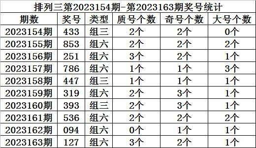上期回顾:排列三第2023163期开奖:127,质合比为3:0,奇偶比为1:2,大小比为2:1。