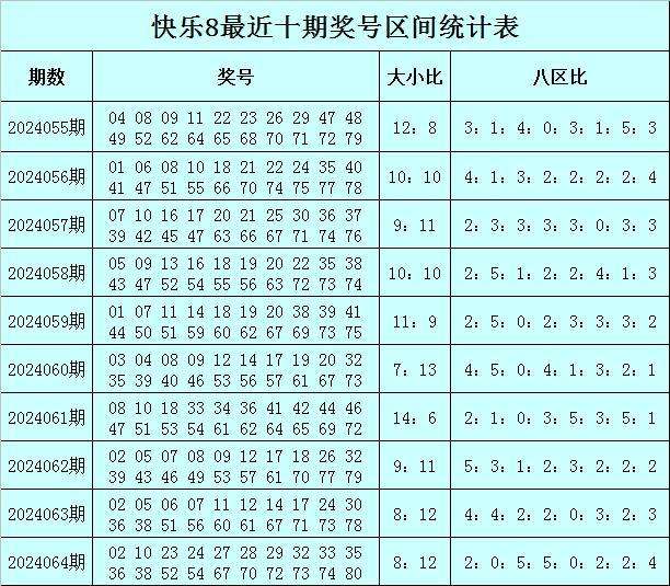 福彩快乐8第2024064期奖号为:02 10 23 24 27 28 29 32 33 35 36 38 52 54 67 70 72 73 74 80,其中奖号大小比为8:12,八区比为2:0:5:5:0:2:2:4。