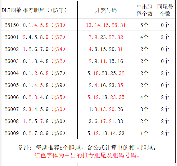 如图,每期推荐胆尾中出1-4个。上期推荐胆尾中出1尾1码!推荐胆尾是按照公式计算的顺序,不定位红球号码的顺序。本期推荐胆尾:9尾/7尾/4尾/2尾/6尾,加推防守胆尾+胆码号码:***(会员专区可见)。个人分析,仅供参考。