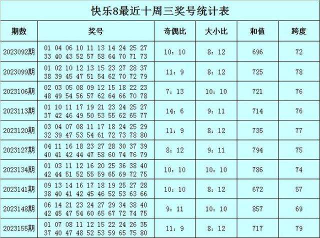 福彩快乐8第2023155期(上周三)开奖回顾:01 07 08 11 12 15 22 24 26 35 37 40 47 48 52 53 59 65 75 80,其中奖号和值为717,跨度为79,奇偶比为11:9,大小比为8:12。