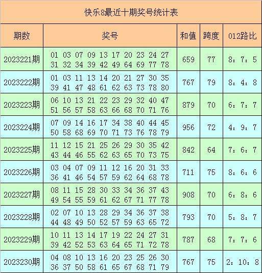 快乐8第2023230期奖号为:04 08 10 13 16 20 23 25 26 30 36 37 50 58 61 65 67 68 71 79,其中奖号012路比为2:10:8,和值为767,跨度为75。