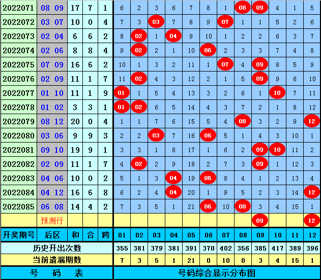 后区分析:上期后区开出二区两码06+06,最近10期后区三区落号比为1:0:1,最近5期后区三区落号比为0:0:2,本期后区号码大范围关注05、06、09、10、12,后区精选两码09、12。