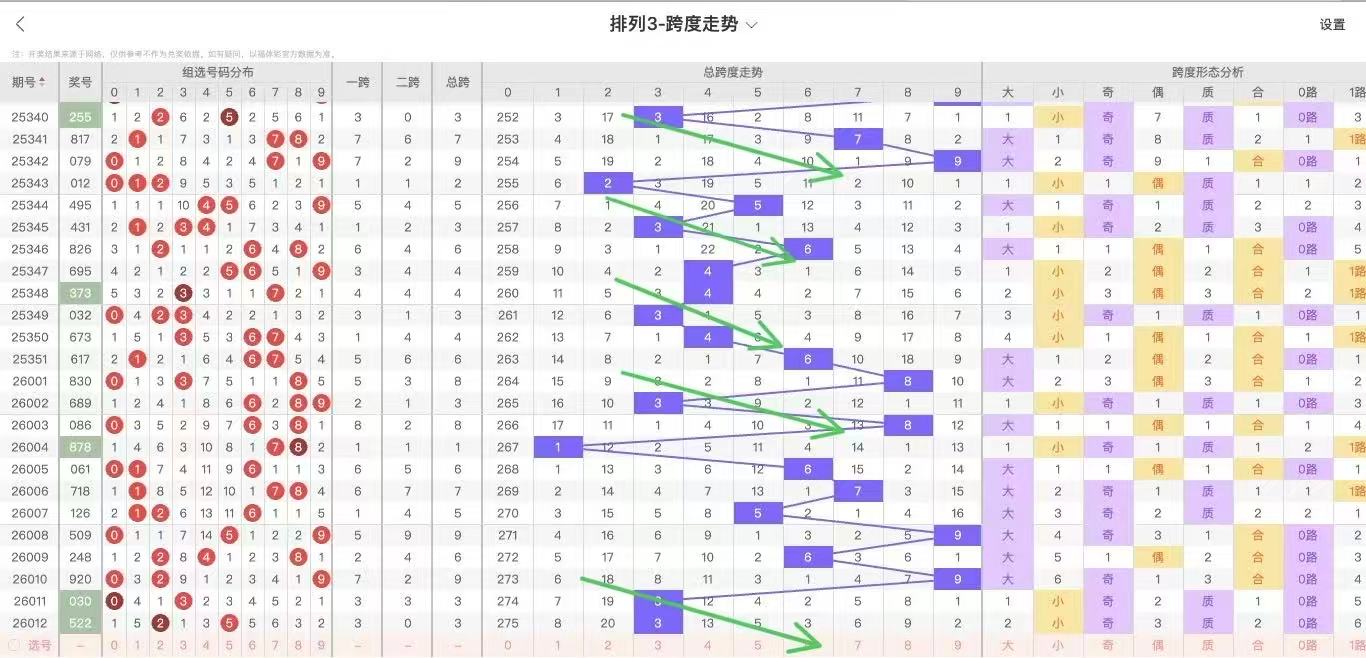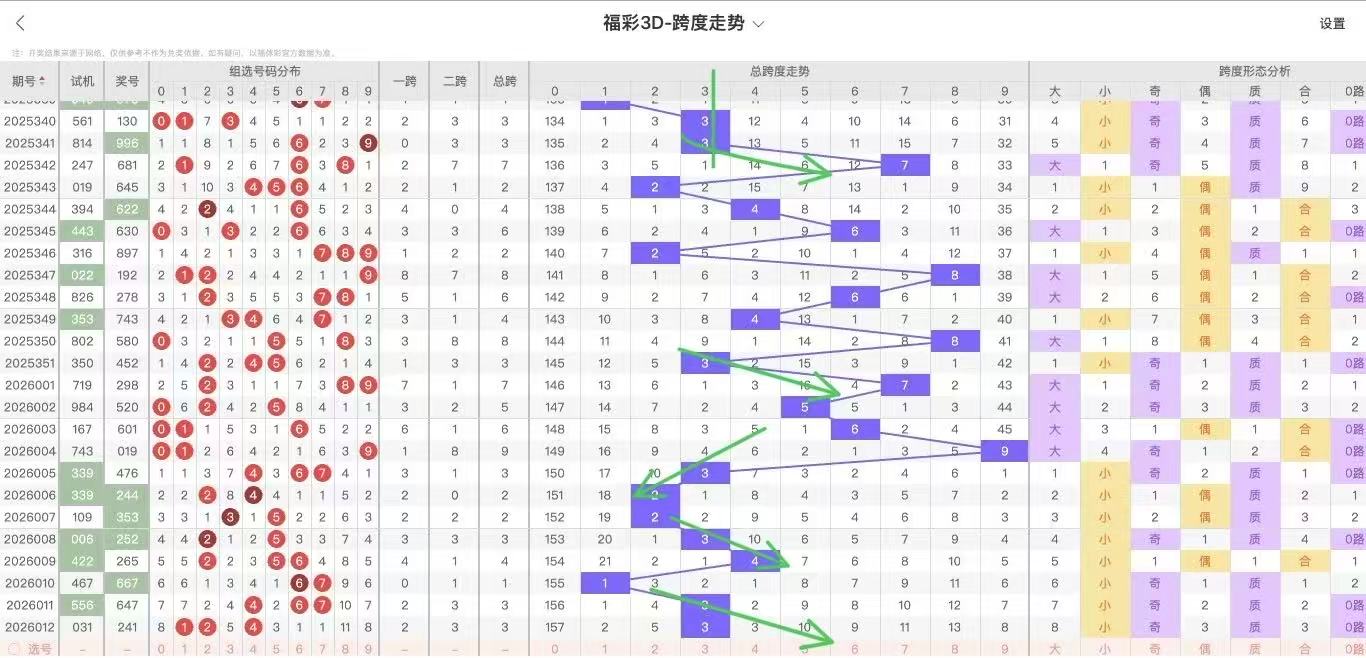 10期内跨度走势为:9-1-6-7-5-9-6-9-3-3,10期内大小跨比为7:3,奇偶跨比8:2,百期内跨度3共开出16次,下期数据:2 8 4 5 3 5 9 5 7 1 6 4 8 3 近期度较热,考虑跨度3开出后容易出大跨度,近期大小规律下小:偶:合,所以接下来继续小跨,偶跨度表现!