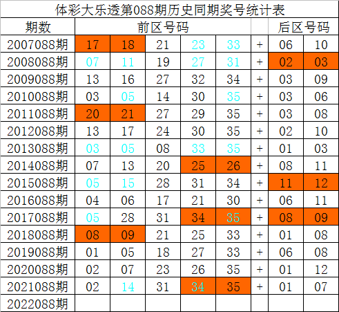 体彩大乐透第088期历史上已开出了15次,其奖号分别为: