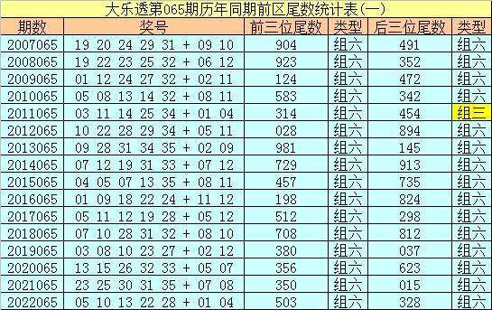 在大乐透第065期历年同期奖号中,前区前三位尾数出号频次分别为:尾数3出现7个,尾数0、5、8出现6个,尾数1、2、9出现5个,尾数4出现4个,尾数7出现3个,尾数6出现1个。其中尾数数字三类型豹子、组三、组六次数比为0:0:16,今年同期前三位尾数类型适当关注组三;