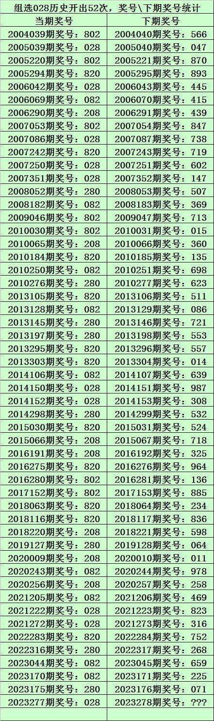 二、组选028分析:排列三历史上已开出52次组选号码028了,其奖号和下期开出奖号统计如下: