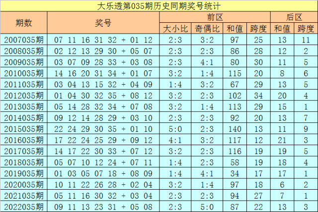 徐欣体彩大乐透第2023035期历史同期奖号分析,历史上第035期同期奖号已开出了16次了。