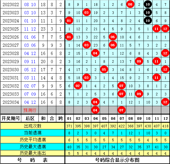 上期回顾:体彩大乐透第2023034期奖号为07、09、10、15、24+04、12,前区奇偶比为3:2,大小比为1:4,和值为65,跨度为17,后区和值为16,跨度为8。