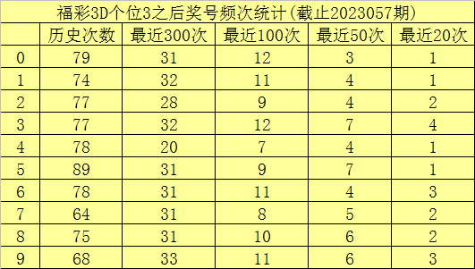 个位杀号:上期个位奖号为3,历史上个位奖号3共开出760次,最近100次个位奖号3出现时,其下期号码0-9开出次数分别为:奖号3、0开出12次,1、6、9开出11次,8开出10次,2、5开出9次,7开出8次,4开出7次。