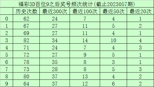 百位杀号:上期百位开出号码9,历史上百位号码9已开出719次了,最近100次百位号码9出现之后,其下期各号码频次分别为:号码3出现14次,8出现13次,9出现12次,1、2出现11次,5出现9次,6、7出现8次,0、4出现7次。