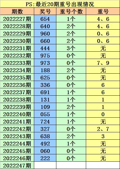 最近100期开奖中,含有重号的奖号有59期,最近20期含有重号的奖号有12期,最近10期含有重号的奖号有6期。本期排除重号。
