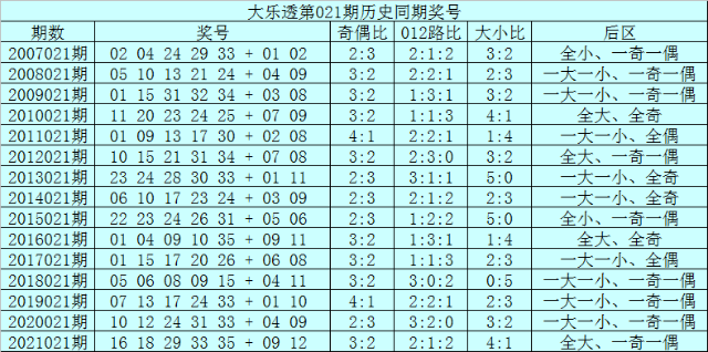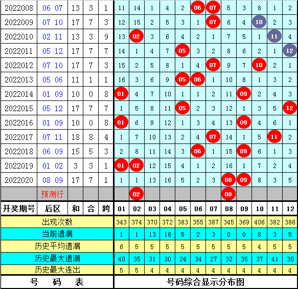 后区历史同期尾数频次分别为:尾数19出现6次、尾数8出现4次、尾数24出现3次、尾数367出现2次、尾数05出现1次,尾数奇偶比为17:13,大小比为15:15,012路比为11:11:8,质合比为14:16,本期后区参考尾数2、8,关注两码02、08。
