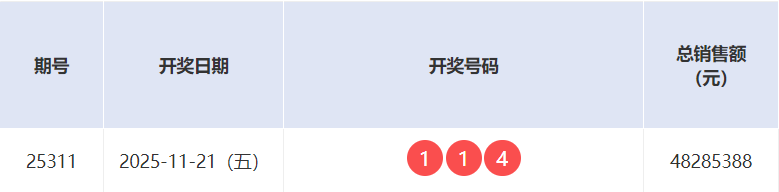 排列三第25311期(2025年11月21日开奖)的开奖号码为 1 1 4。