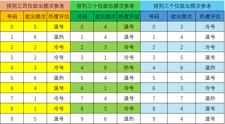 012路分析:上期012路比为1:2:0,1路号码强势开出。根据冷热号系统分析,0路和2路号码回补需求明显。本期在012路的分析中,预计各路号码将趋于平衡,推荐关注1:1:1或1:0:2的余数比。