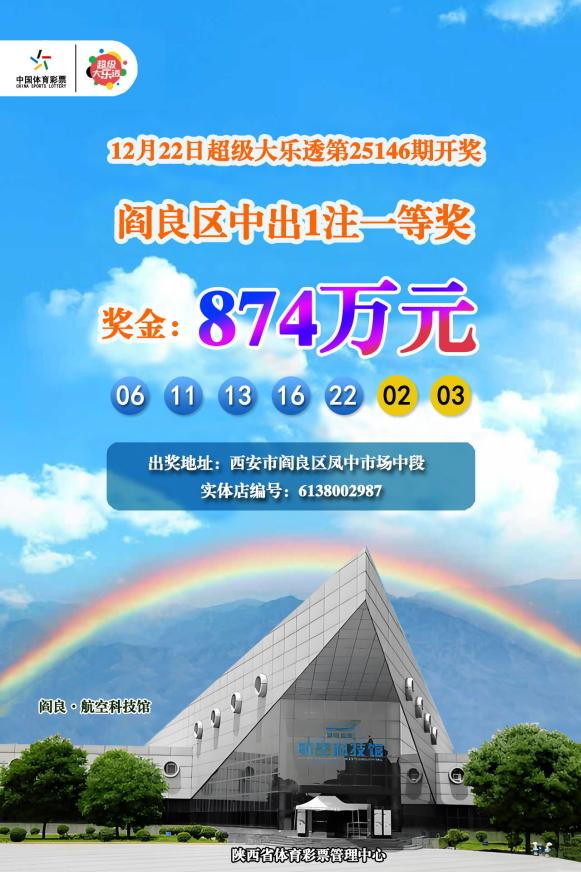 12月22日超级大乐透第25146期开奖,陕西中出一注一等奖,单注奖金8749278元,大奖出自西安市阎良区凤中市场中段,实体店编号:6138002987。这是今年以来我省中得的第30注大乐透大奖。