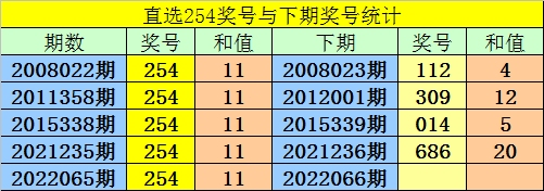 第2022065期3D奖号为:254,历史上该号码直选开出5次,下期号码分别为:112、309、014、686。