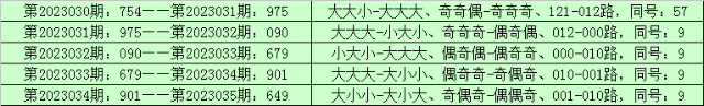 统计排列三已开出的奖号发现,在连续5期(第2023030期-第2023034)奖号为:754-975-090-679-901。