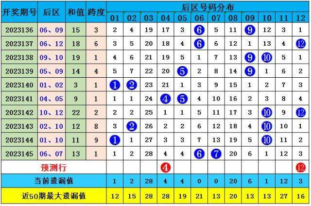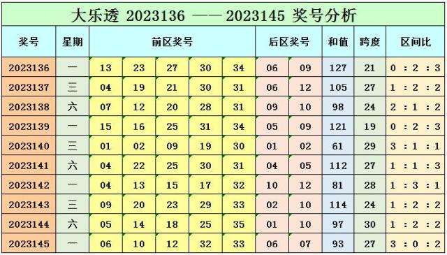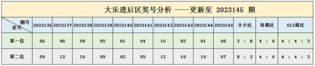 大乐透第2023145期奖号为:前区06 10 12 32 33;后区号码为06 07。前区号码大小比为2:3,三区比为3:0:2,奇偶比为1:4。后区开出偶奇组合。