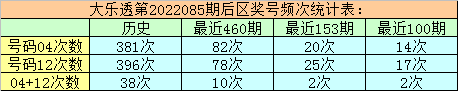 万妙仙大乐透第2022085期前区热号分析:(统计最近460期数据)