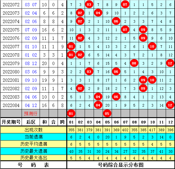万妙仙大乐透第2022085期后区冷热号码统计: