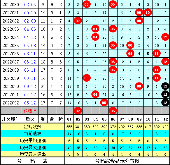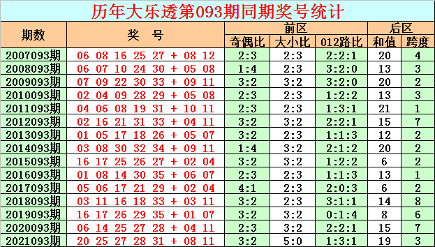 在历史同期开奖中,后区号码和值奇偶为7:8,基本相等,本期适当关注偶号和值开出,参考和值8。