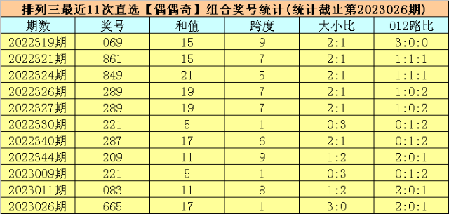 开奖回顾:排列三第2023026期开出奖号:665,类型为组三,和值为17,奇偶比为1:2,大小比为3:0,跨度为1。
