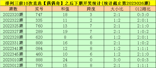 5。下期奖号跨度分别开出:3、2、7、7、6、8、8、6、0、8,其中跨度012路比为4:2:4,大小比7:3,奇偶比为3:7,本期适当关注奇数跨度开出,参考跨度9。