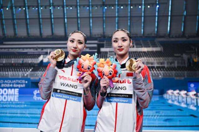 ▲王柳懿/王芊懿获2024年世界游泳锦标赛花样游泳女子双人自由自选决赛金牌。 新华社发