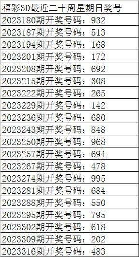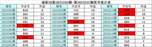 上期回顾:福彩3D第2023322期奖号为:804,其中奖号组选类型为:组六,奇偶比为0:3,大小比为1:2,012路比为1:1:1,和值为12,跨度为8。