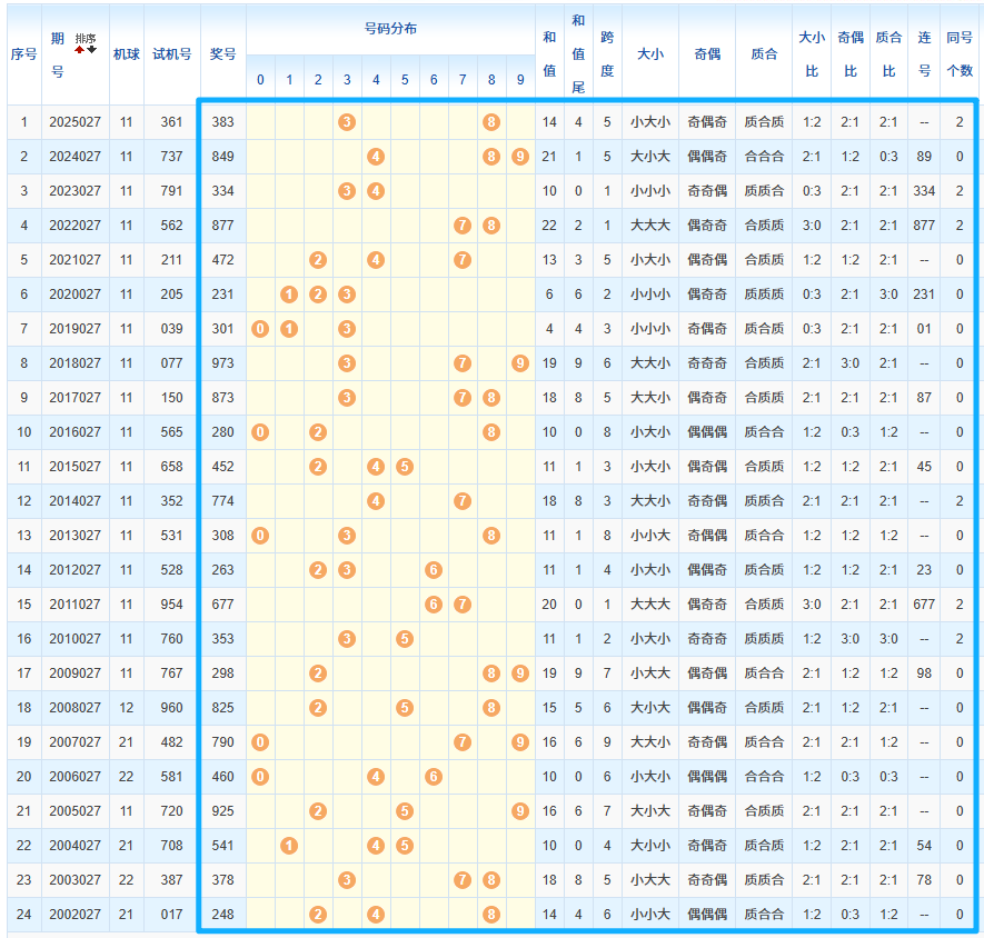 经统计0号出现5次、1号出现3次、2号出现9次、3号出现10次、4号出现8次、5号出现5次、6号出现3次、7号出8次、8号出现10次、9号出现5次.统计后出现次数靠前的数字作为我们的备选号码.其号码有23478等