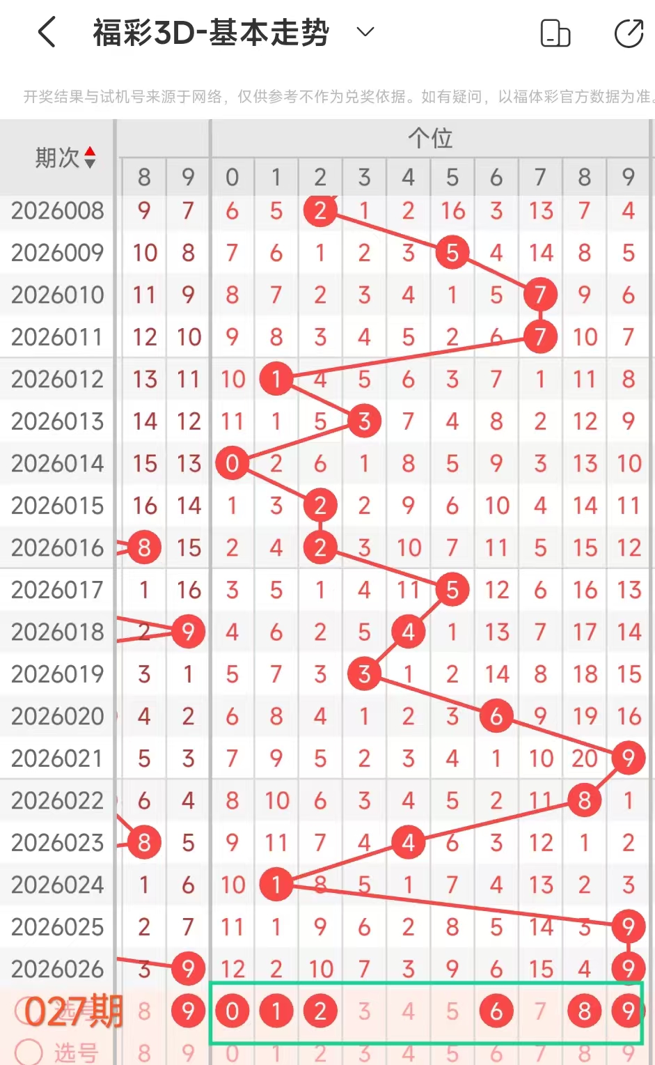 3、当个位开出9后下期开出:204506689,经统计0号出2次、1号出现0次、2号出现1次、3号出现0次、4号出现1次、5号出现1次、6号出现2次、7号出现0次、8号出现1次、9号出现1次。观察发现06号近期出现频繁,本期可以考虑。