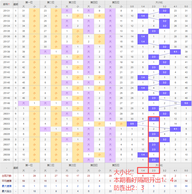 上期大小比:2:3,近10期大小比出现情况:3:2、2:3、0:5、4:1、2:3、3:2、2:3、2:3、1:4、2:3,最近10期出现2期3:2,出现5期2:3,出现1期4:1,出现1期1:4,出现0期5:0,出现1期0:5,根据近10期规律本期看好隔期的1:4,防连出2:3,综上所述推荐大小比推荐:2:3,重点关注:1:4。