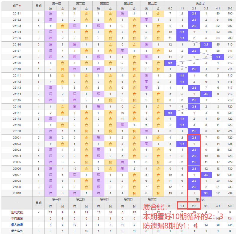 上期质合比:3:2,近10期质合比出现情况:2:3、1:4、2:3、2:3、2:3、2:3、3:2、2:3、2:3、3:2,最近10期出现2期3:2,出现7期2:3,出现0期4:1,出现1期1:4,出现0期5:0,出现0期0:5,根据近10期规律本期看好10期循环出2:3,防遗漏8期的1:4,综上所述推荐质合比推荐:1:4,重点关注:2:3。