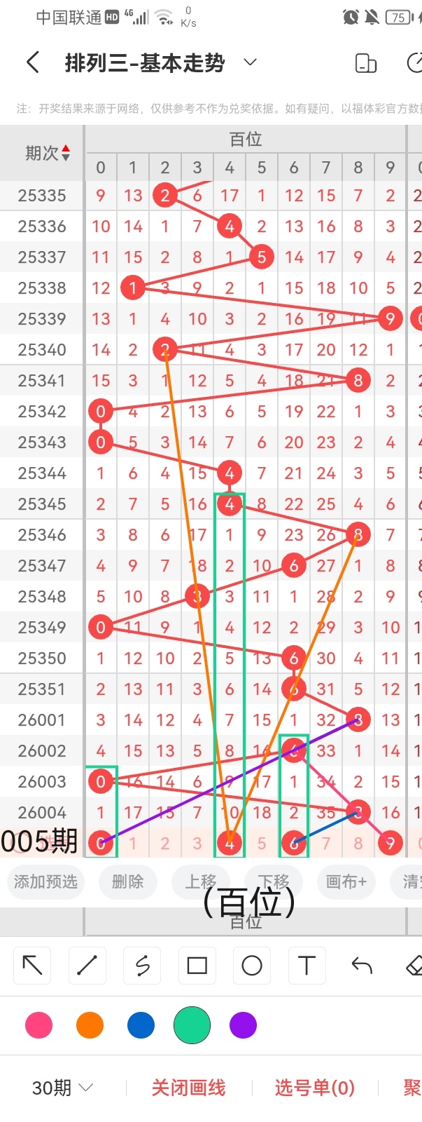 首先,小梁给大家每期分享一个体彩排列三杀百位的号码:8,正确率高达95.36%。其次,我们根据上图中画线的思路及走势可以看出,号码0与前几期开出的号码呈斜三连的走位且呈隔期回补的走势,跨度是8;号码4与前几期开出的号码呈隔十期回补的走位且呈左右斜三连的走势,跨度4;号码6与前几期开出的号码呈隔两期回补的走势且呈斜连前后相互平行的走位,跨度为2;大家多多支持小梁。然后,如图所示,遗落16期未出的号码9与前几期开出的号码呈斜三连的走势,跨度1。综上所述,小梁推荐百位的号码是:0、4、6、9。