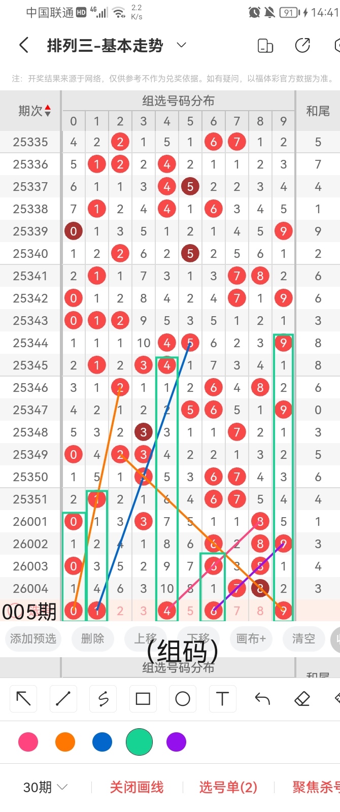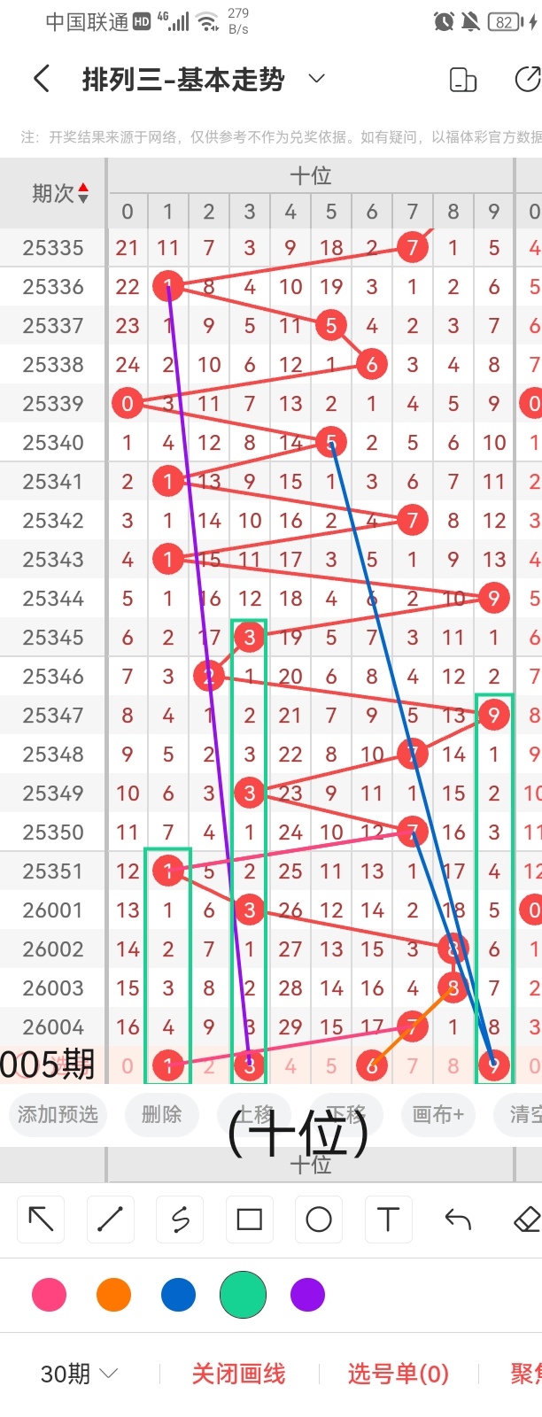 我们结合上图中的画线思路分析,号码0与前几期开出的号码呈斜三连的走位且呈连续隔期回补的走势;号码1与前几期开出的号码呈斜三连的走势且呈隔四期回补的走位;号码4与前几期开出的号码呈隔十期回补的走位且呈斜三连的走势;号码6与前几期开出的号码呈隔期回补的走势且呈斜四连的走位;号码9与前几期开出的号码呈斜五连的走位且呈隔两期回补前后相互对称的走势。