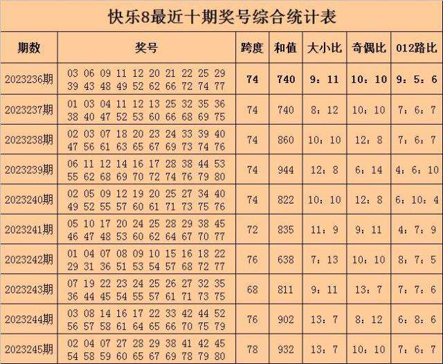 福彩快乐8第2023245期开出奖号:02 04 07 27 28 29 38 41 42 45 54 58 59 60 65 67 69 78 79 80,其中奖号跨度开出78,和值开出932,大小比开出13:7,奇偶比开出10:10,012路比开出7:6:7。