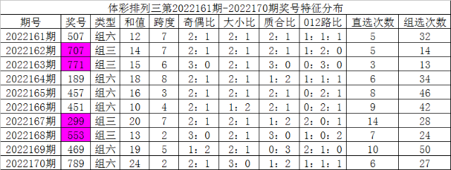 开奖公告:体彩排列三第2022170期开出奖号:789。组六,有重号:9,奇偶比2:1,大小比3:0,012比1:1:1,和值24,跨度2。