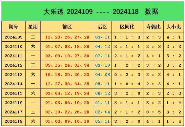 上期回顾:大乐透第2024118期奖号为:前区01、03、09、16、19,后区05、11,前区奖号三区比为3:2:0,奇偶比为4:1,大小比为1:4,后区开出小大组合05、11