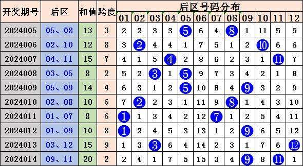 后区冷热分析(最近5期未开出的号码为冷号):上期大乐透后区开出热热号码09 11,近十期开出冷冷形态1次,冷热形态1次,热冷形态4次,热热形态4次。本期推荐冷热形态开出,本期推荐5码:04 05 06 08 12,精选号码04 08。