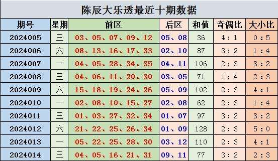 上期回顾,大乐透第2024014开奖,本期奖号:前区04 05 16 21 31;后区09 11,当期前区号码大小比为2:3,三区比2:2:1,奇偶比3:2。前区开出连号04 05,开出重号05。