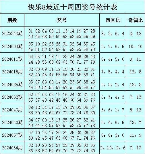 福彩快乐8第2024064期(上周四)开奖回顾:02 10 23 24 27 28 29 32 33 35 36 38 52 54 67 70 72 73 74 80,其中奖号四区比为2:10:2:6奇偶比为7:13。